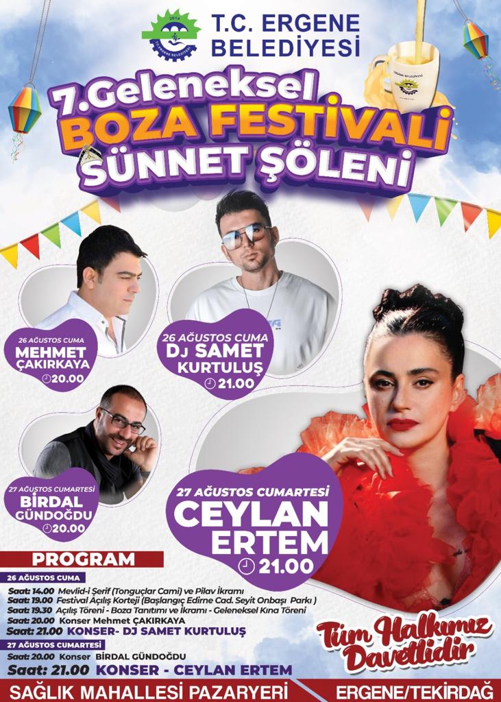 Ergene Belediyesi 7’inci Geleneksel Boza Festivali ve Sünnet şöleninde 27 Ağustos Cumartesi günüde konser programları düzenlenecekken 27 Ağustos Cumartesi günü Sağlık Mahallesi Pazar alanında kurulan konser alanında saat 20.00’da Birdal Gündoğdu ve saat 21.00’da da Türkiye’nin ünlü ses sanatçılarından biri olan Ceylan Ertem sahne alacak.