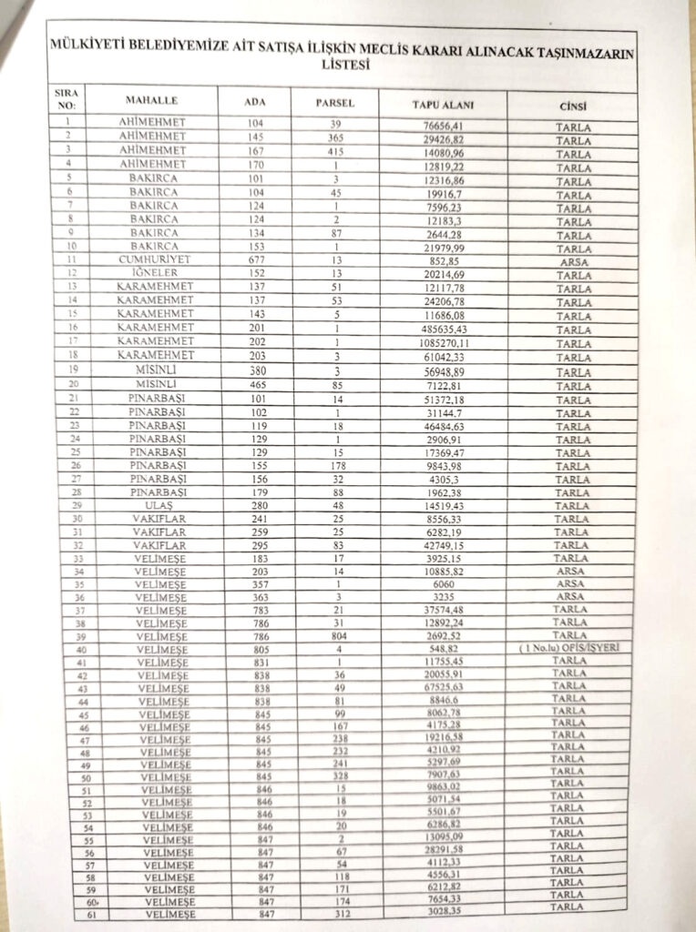 Satışa çıkarılan alanlar arasında Karamehmet Mahallesi’nde 1.6 milyon metrekarelik devasa bir alan yer alırken, Velimeşe’de 580 bin, Pınarbaşı’nda ise 165 bin metrekarelik taşınmazlar dikkat çekiyor. Bu satışlarla birlikte Ergene’nin farklı noktalarında toplamda 11 mahallede kamu taşınmazlarının el değiştirmesi söz konusu olacak.