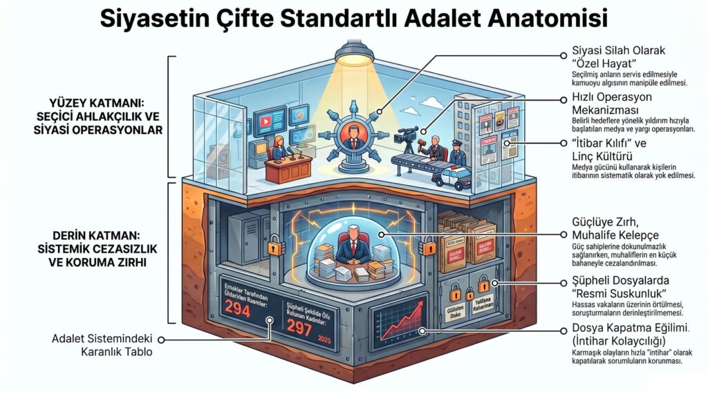 Bu ülkenin esas çürümesi de tam burada başlıyor. Erkek egemen siyaset, kendi ahlaksızlığını ahlak nutuklarıyla örtüyor. Güçlülerin rezaleti “özel hayat” oluyor; muhalifin hatası “operasyon” oluyor. Güçlü erkeğin çevresindeki kadın ölümü “şüpheli dosya” olarak yıllarca karanlıkta kalıyor; muhalifin mahremiyeti birkaç saat içinde manşete çekiliyor.