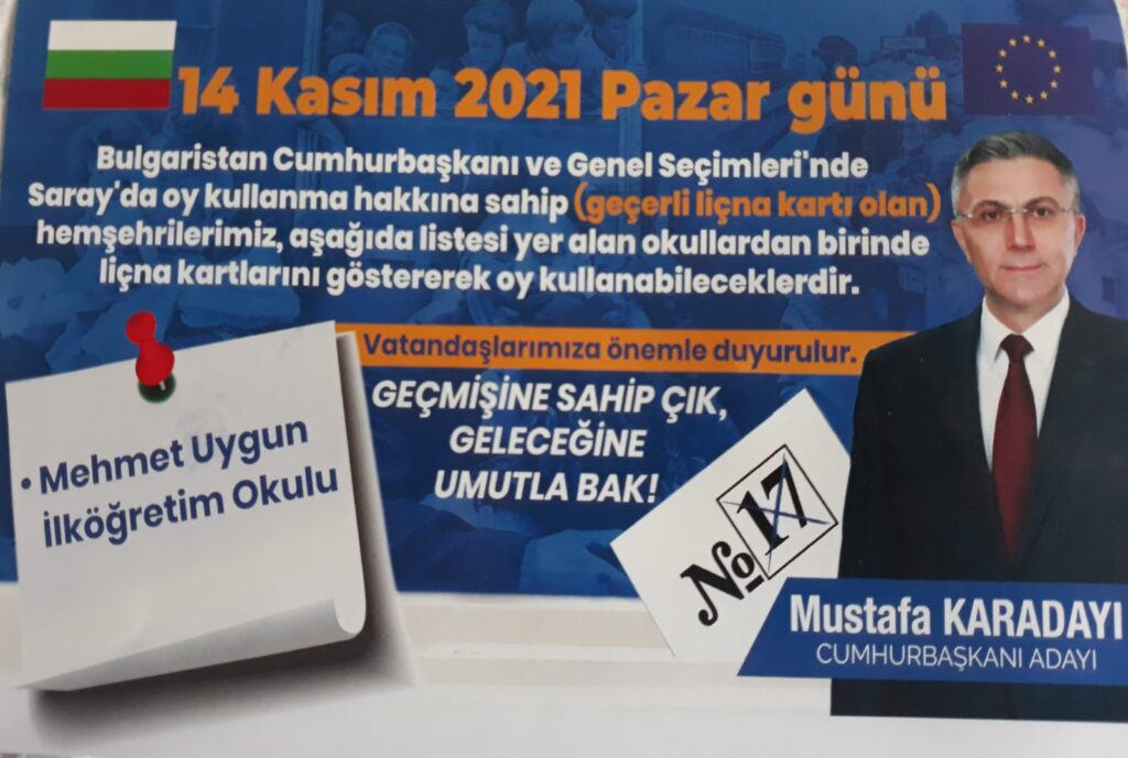 Bulgaristan’daki soydaşlarımız için büyük önem arz eden Bulgaristan Cumhurbaşkanı ve Genel Seçimleri, 14 Kasım Pazar günü gerçekleştirilecek. 14 Kasım 2021 Pazar günü tekrarlanacak olan Bulgaristan Cumhurbaşkanı ve Genel Seçimleri’nde Saray’da oy kullanma hakkına sahip (geçerli liçna kartı olan) hemşehrilerimiz, Mehmet Uygun İlkokulu’nda liçna kartlarını göstererek oylarını kullanabilecek.