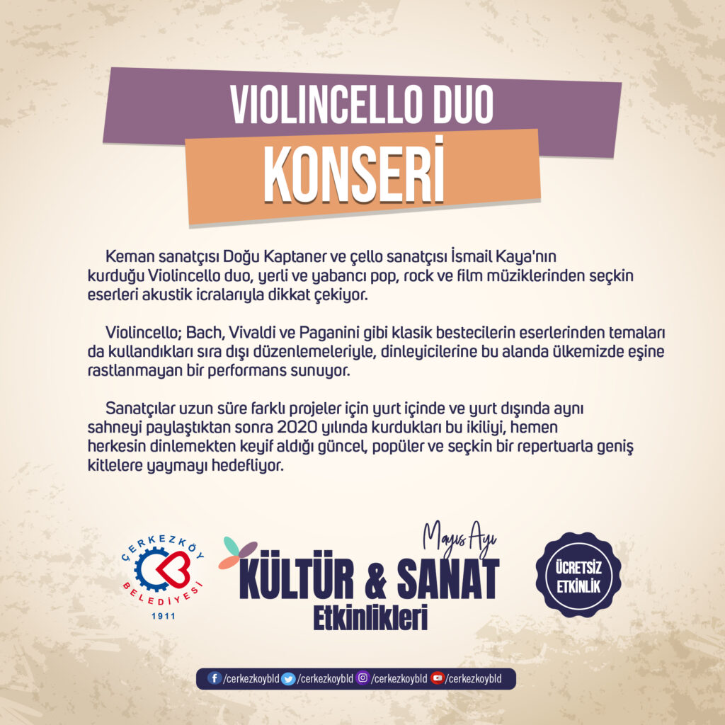 Atatürk Kültür Merkezi’nde verilecek olan ‘Violincello Duo’ konserine tüm sanatseverleri davet eden Çerkezköy Belediye Başkanı Vahap Akay, “Keman Sanatçısı Doğu Kaptaner ve Viyolonsel Sanatçısı İsmail Kaya’nın vereceği ‘Violincello Duo’ konserimize tüm keman ve viyolonsel tutkunlarını bekliyoruz. ‘Violincello Duo’ konserimizi izlemek isteyen sanatseverler ücretsiz davetiyelerini 25 Mayıs Çarşamba gününden itibaren Atatürk Kültür Merkezi’ndeki gişelerden temin edebilirler” dedi.