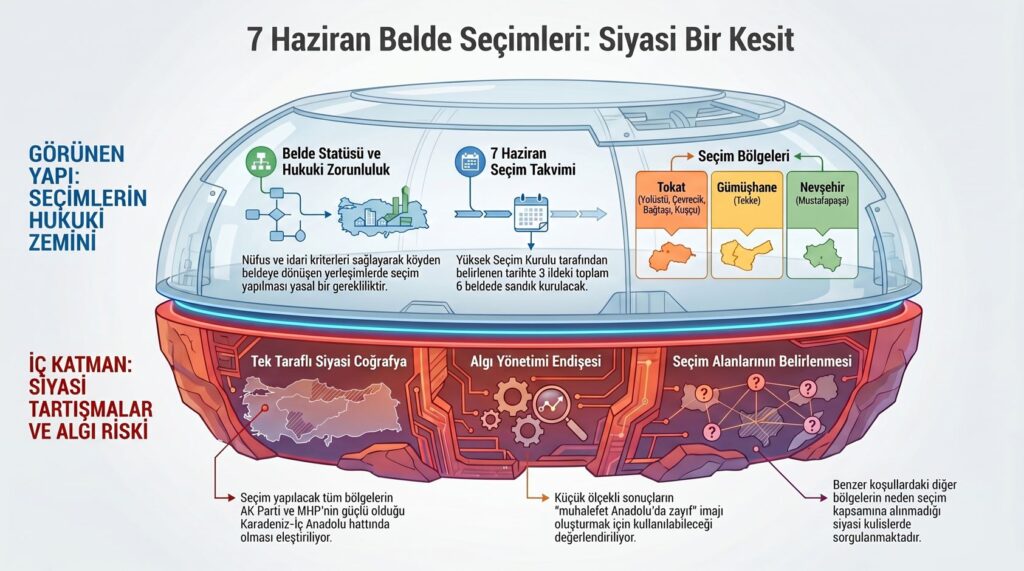 Tokat, Gümüşhane ve Nevşehir’de yapılacak seçimler “hukuki zorunluluk” kapsamında gösteriliyor. Ancak seçim bölgelerinin tamamının AK Parti ve MHP’nin güçlü olduğu yerlerden oluşması, siyasi tartışmayı büyüttü.