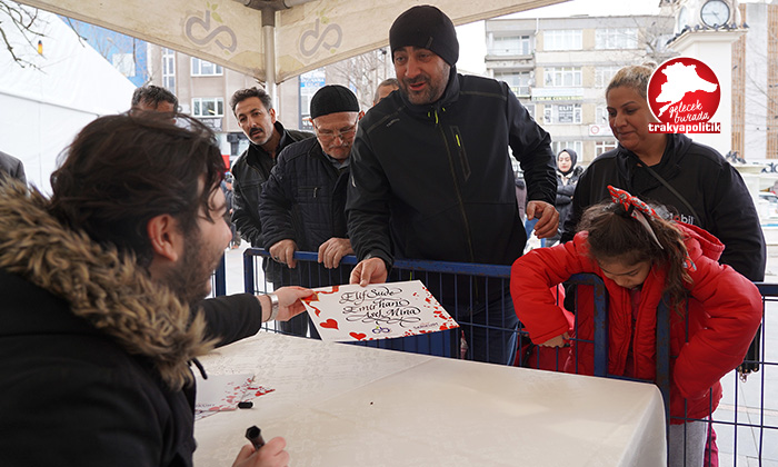 Cumhuriyet Meydanı’nda kurulan standa gelen vatandaşların isimleri kaligrafi sanatçısı tarafından özel teknik ile kaleme alınırken, sevdiklerinin isimlerinin yazılı olduğu kaligrafiler vatandaşlara hediye edildi.