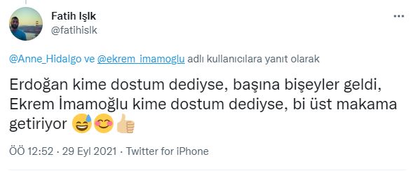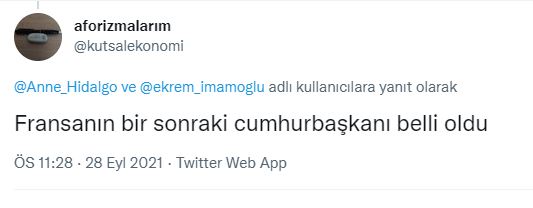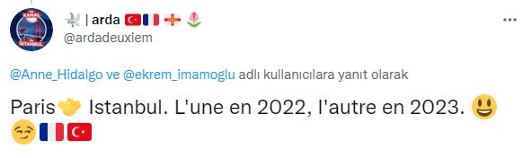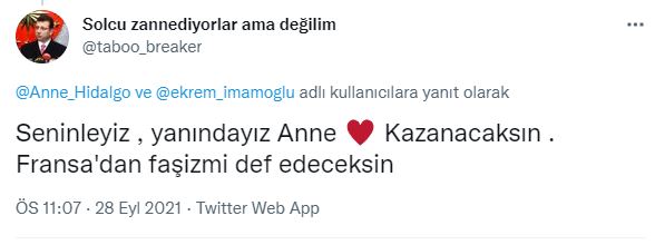 Paris Belediye Başkanı Hidalgo ise kendisine 28 Eylül’ün son saatlerinde kendisinin mesajını alıntılayarak İmamoğlu’na Türkçe olarak seslendi.