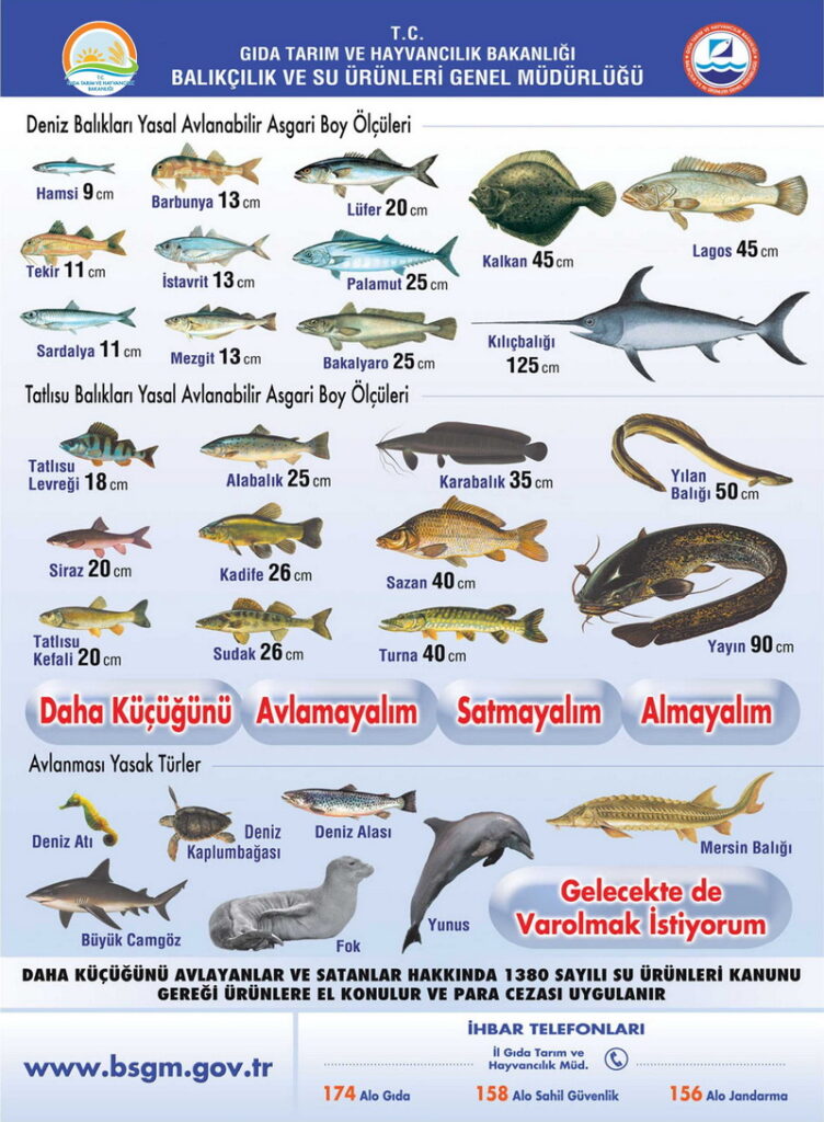 Balık avı sezonunun başlamasıyla birlikte, T.C. Gıda Tarım ve Hayvancılık Bakanlığı Balıkçılık ve Su Ürünleri Genel Müdürlüğü, kamuoyuna deniz ve tatlısu balıkları için geçerli olan asgari avlanabilir boy ölçülerini hatırlattı. Yasal düzenleme, hem balık stoklarının korunması hem de sürdürülebilir balıkçılığın sağlanması amacıyla hazırlandı.