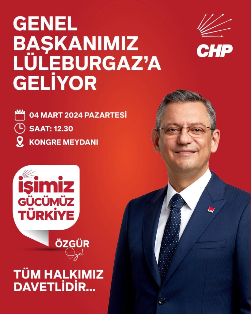Cumhuriyet Halk Partisi (CHP) Genel Başkanı Özgür Özel, 4 Mart Pazartesi günü Kırklareli ziyaretleri kapsamında Lüleburgaz’a gelecek.