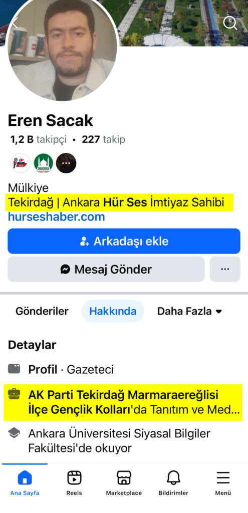 Bu yalan haberleri ortaya atan kişi olan Eren Sacak ise kendi profilinde Ak Parti Marmaraereğlisi Gençlik Kolları Medya ve Tanıtım Başkanı olduğunu yazmış. Dolayısıyla bir siyasi partiyi, hem de yıllardan beri iktidarda olan bir siyasi partiyi bağlayan bir yerde duruyor. Bu kişi gerçekten bu titre sahip mi? Sahipse parti yöneticileri buna neden ses çıkarmıyor?