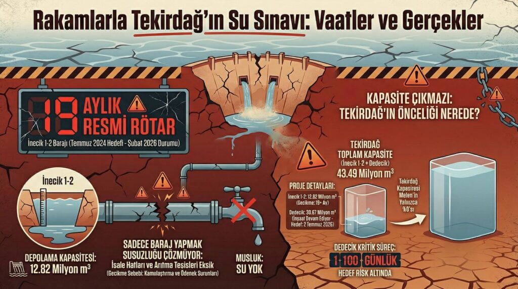 Bu nedenle 2026 başında gündeme gelen “İnecik 1–2 ve Dedecik barajları içme suyu isale hattı” ihale başlıkları kritik bir alarm zili gibi çalıyor: Barajlar gecikirse, iletim hatları da geriden gelirse, Tekirdağ’ın su güvenliği takvimi 2026’yı da aşabilir.