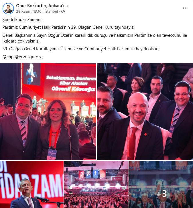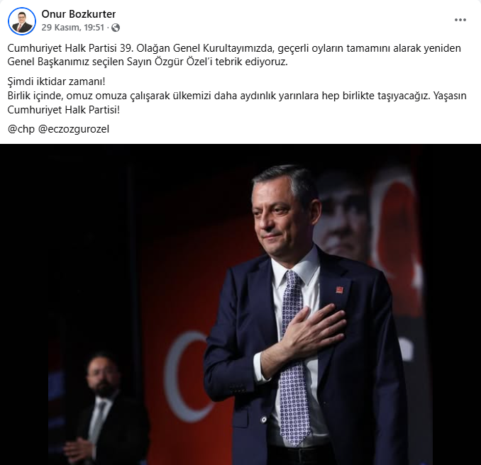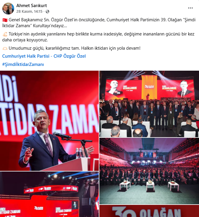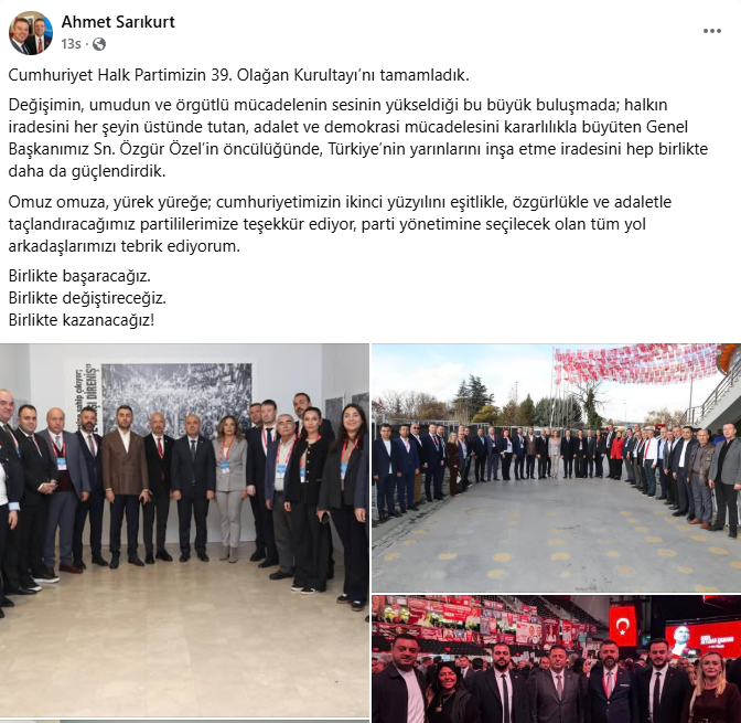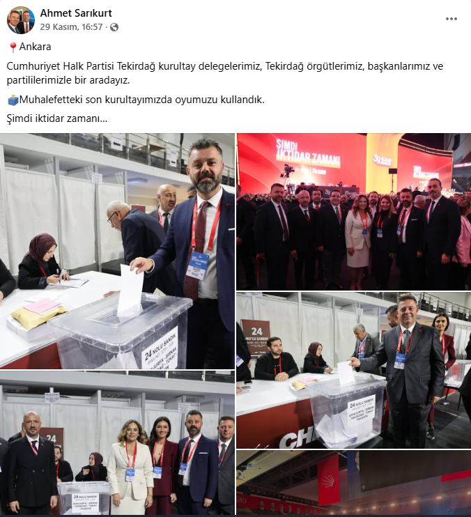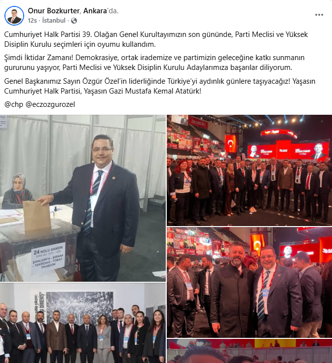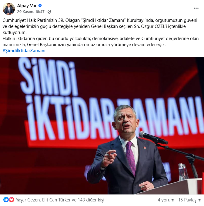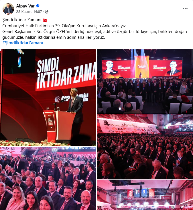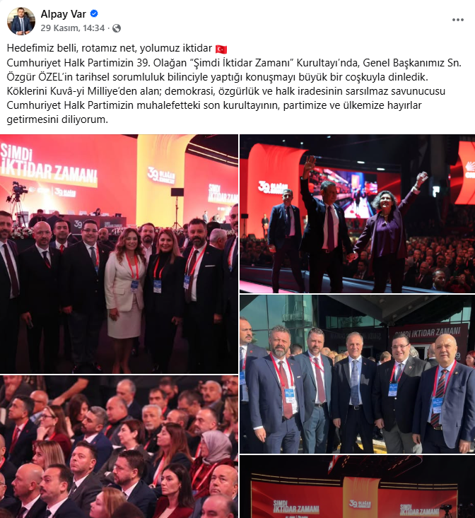Şarköy Belediye Başkanı Alpay Var, sosyal medyayı görece seyrek kullanan bir profil olmasına rağmen kurultaydan üç paylaşım yaptı. İlk günde salondan geniş karelerle Trakya heyetiyle birlik vurgusu verdi; ikinci gün kürsü anlarını ve tribün atmosferini öne çıkardı. Son olarak Özgür Özel’in yeniden genel başkan seçilmesini tebrik eden ayrı bir mesaj yayınlayarak “hedefimiz belli, rotamız net, yolumuz iktidar” çizgisini sürdürdü. Var’ın akışı; abartısız fakat tutarlı bir dil ve “şimdi iktidar zamanı” etiketini merkeze alan disiplinli bir görünürlük sundu.