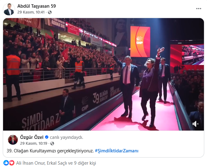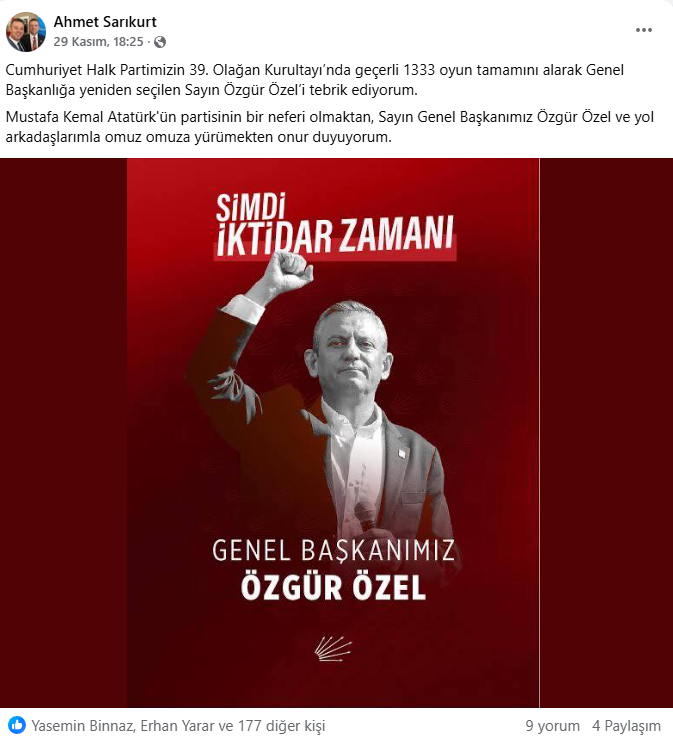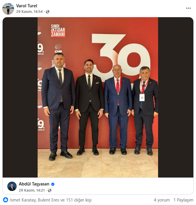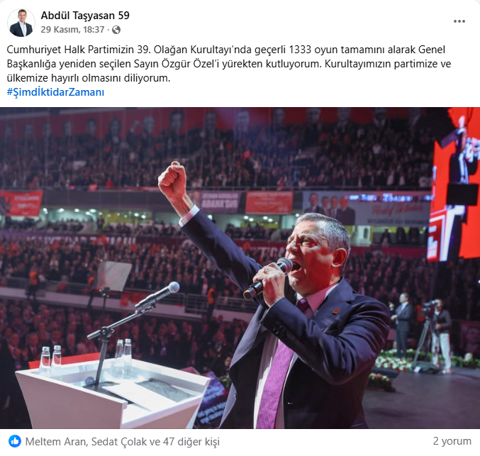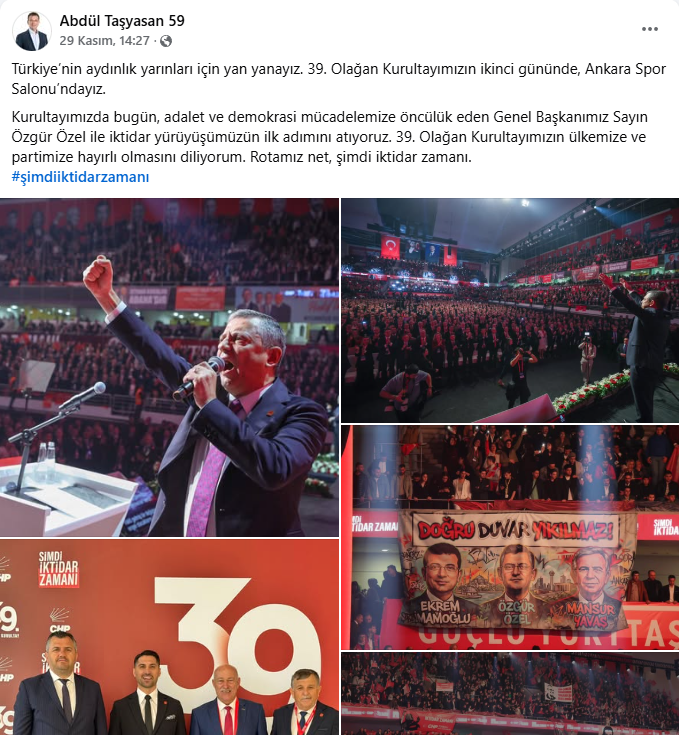 Saray Belediye Başkanı Abdül Taşyasan, kurultay sürecini genel merkez tabanlı olarak takipçilerine aktardı. İki gönderisinde, yeniden Genel Başkan seçilen Özgür Özel’in içeriklerinden alıntı yaparak mesajını güçlendirdi. Kendi metinlerinde “rotamız net, şimdi iktidar zamanı” vurgusunu öne çıkardı. Taşyasan’ın kurultaya dair kendi kadrajı sınırlı kaldı. Trakya heyetiyle toplu bir fotoğraf paylaşmadı. sahadaki tek hatıra karesi Muratlı Belediye Başkanı Varol Türel, CHP Çerkezköy İlçe Başkanı Sedat Çolak ve CHP Saray İlçe Başkanı Erol Gürler ile birlikte verdiği poz oldu. Bu tercih, mesaj yoğunluğunu genel kurultay atmosferi ve Özel’in liderlik vurgusu üzerine kuran bir iletişim çizgisine işaret etti.