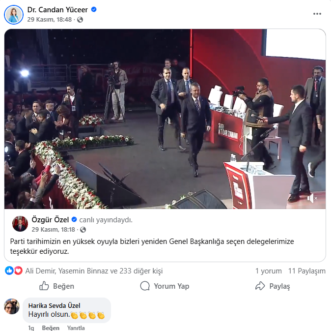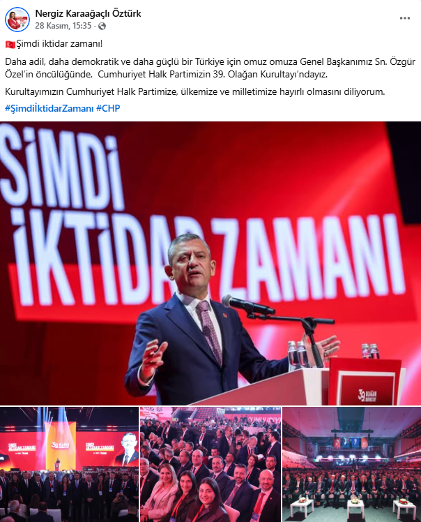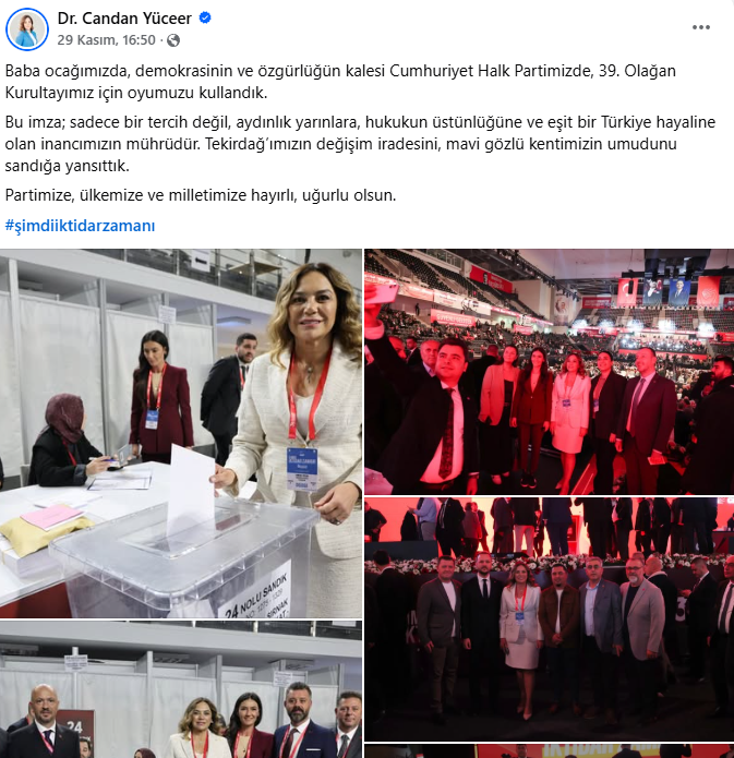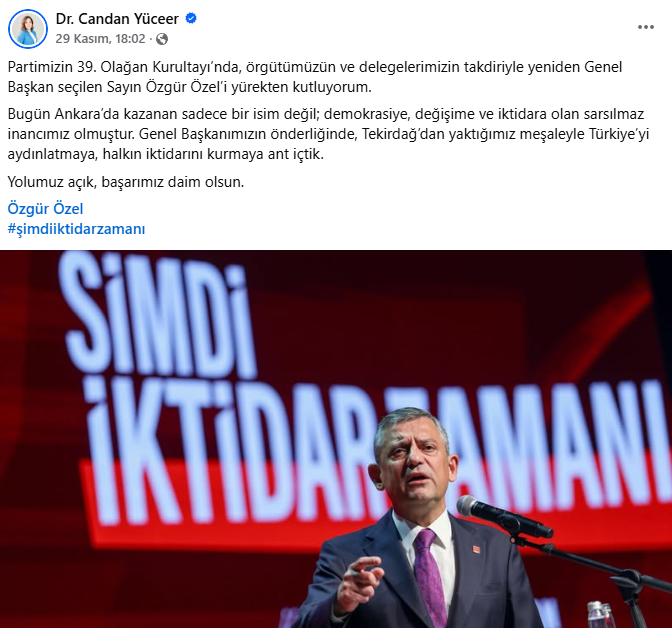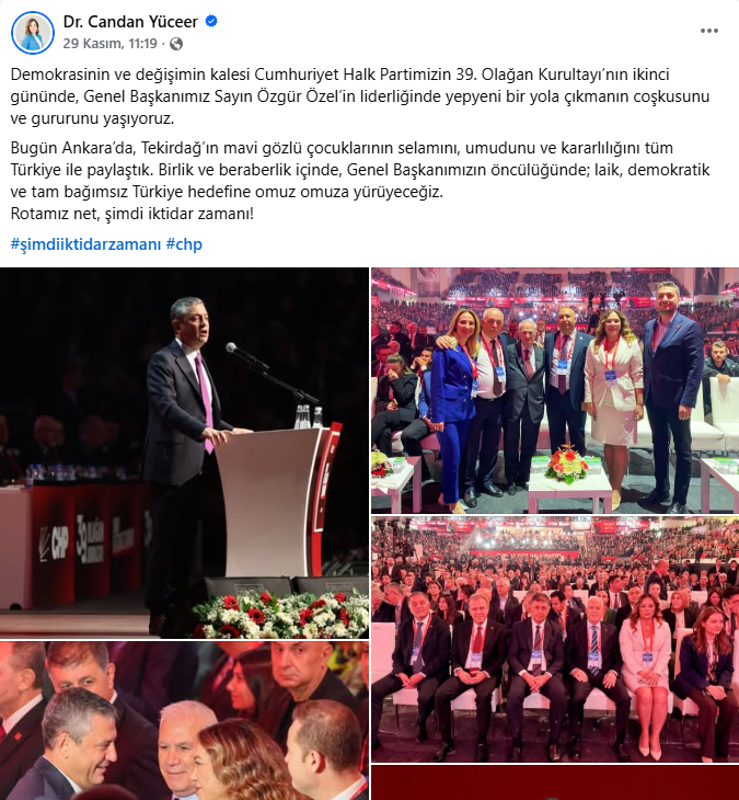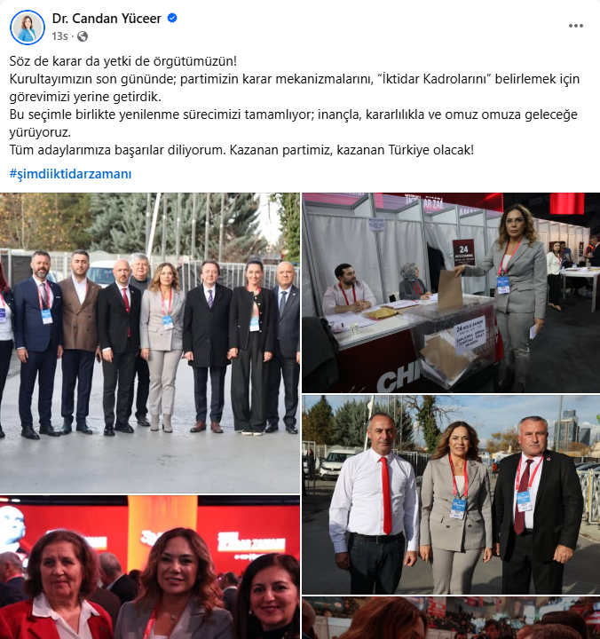 Kurultayın en görünür yerel aktörlerinden biri oldu. Gün boyu ardışık paylaşımlarla hem salondaki dinamizmi hem de örgütle kurduğu teması gösterdi. Sandık başında oy kullanırken çekilen kareyi “iktidar kadroları” ve “yetki örgütümüzün” mesajıyla yayına aldı. Salonda ve dışarıda Trakya heyetiyle toplu fotoğraflar paylaştı; Genel Başkan Özgür Özel’in yeniden seçilmesini kutlayan ayrı bir metinle “laik, demokratik ve tam bağımsız Türkiye” hedefini vurguladı. Özel’in kürsü anlarını da canlı yayın kesitleriyle aktararak kurultayın nabzını sayfasına taşıdı. Hashtag tercihini istikrarlı biçimde #şimdiiktidarzamanı etrafında topladı. Trakya il başkanları ve delegelere özel teşekkür ve selamlarla sahne arkası diplomasisini görünür kıldı.