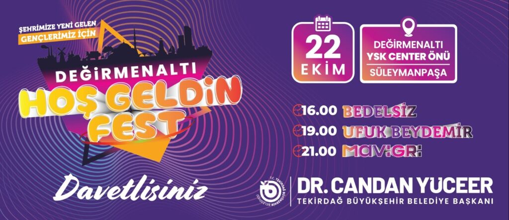 Tekirdağ Büyükşehir Belediyesi, kente yeni gelen üniversite öğrencileri için “Değirmenaltı Hoş Geldin Fest” adıyla bir festival düzenliyor. Gençlere unutulmaz bir gün yaşatacak festivalde Bedelsiz, Ufuk Beydemir ve Mavi Gri gibi sevilen müzik grupları ve sanatçılar sahne alacak.